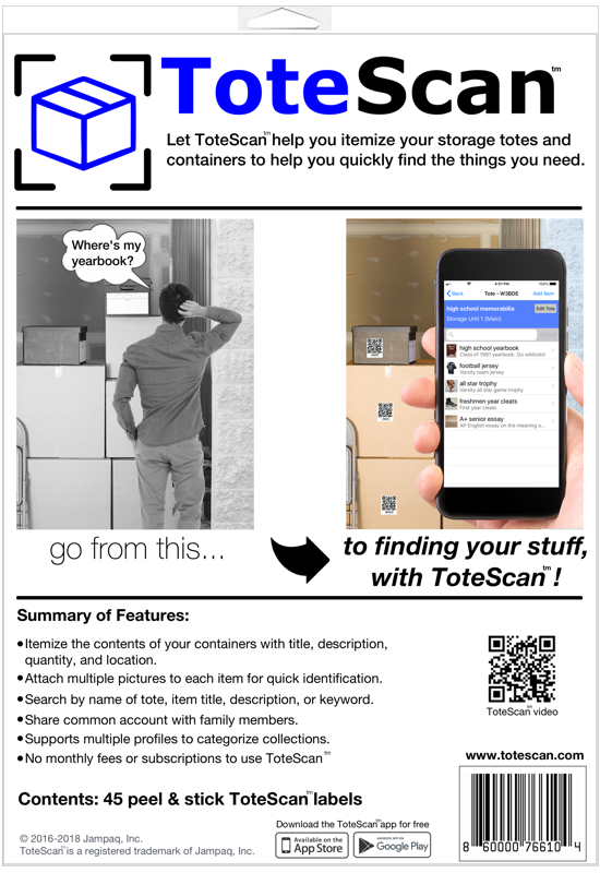 ToteScan™ labels are the heart of the ToteScan™ system. You place ToteScan™ labels onto your totes, containers or boxes and easily itemize their contents using the ToteScan™ app.