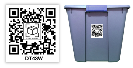 This is an example of a ToteScan™ label. Each label is based on the common QR barcode format, and is uniquely tied to your account and a specific tote or container to which you've attached it. The ToteScan™ label can be quickly scanned using the ToteScan™ app. Alternatively, a unique alpha-numeric code exists on each label so you can visually identify the tote with your eyes.